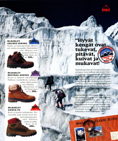 Yksi kaveri sai vihiä, että Kesport oli lanseeraamassa McKinley-tuoteperhettä Suomeen. Keski-Euroopassa sitä oli ollut myynnissä jo joitakin vuosia. Hän tiesi meidän retkikuntasuunnitelmasta ja antoi vinkin. Meidän tehtävä oli sen jälkeen vakuuttaa Keskon Jussi Mikkola sponsoroinnin järkevyydestä. Kaikki meni hyvin ja kaikki olivat tyytyväisiä. Kesällä 1994 Keskolla oli tuotekatalogi, jossa oli meidän valokuvia ja tarinoita sekä Keskon tuotteita. Kannessa oli minun valokuva Pisangin seinämästä vuodelta 1986. Kenkäsivulla oli kaverin kuva Mingbo Lasta noin vuodelta 1991. Ja niin edelleen.