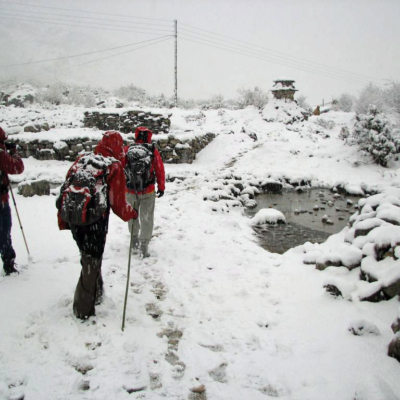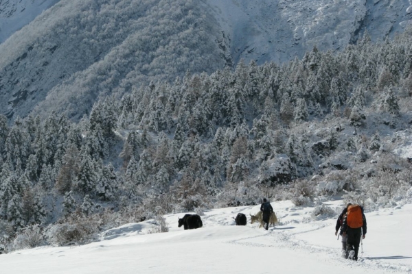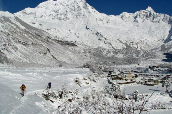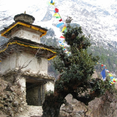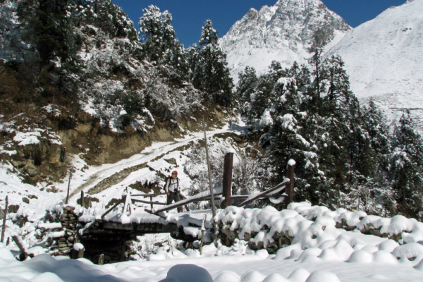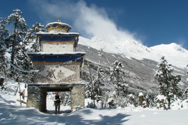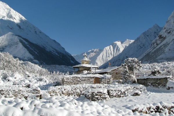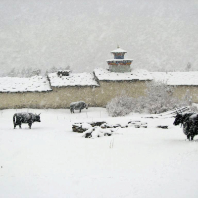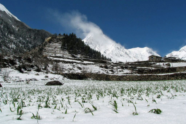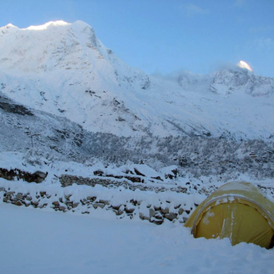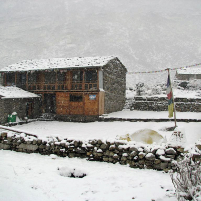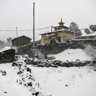 Lumisade ei hellittänyt ja solassa oli kuulemma lunta entuudestaan pari metriä. Ei auttanut muu kuin kääntyä ympäri ja siirtyä Marsyangdin laaksoon toista kautta.