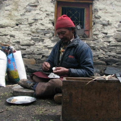 Tuossa vieressä on valokuva, johon liittyy tarina. Naarissa ajoin ”lepopäivänä” parran, mutta siitä oli jo aikaa. Tatopanissa otimme rennosti ja söin Dhaulagiri special dal baat -annoksen, joka on suunnattoman kokoinen. Ilmakin oli lämmin. Käpyttelimme kylän raittia kunnes löysin etsimäni: parturi. Parturi suti naaman täyteen vaahtoa, myös suun ympärille. Pidin suun kiinni. Parturi ryhtyi ajamaan veitsellä partaa ja painoi sormella sieraimen kiinni. Havahduin siihen, että olin pitkälläni laverilla ja kaksi naista yrittää saada minua virkoamaan. Olin pyörtynyt. Verenkierto työsti vatsassa dal baatia ja hengitystiet olivat tukossa. Happi loppui. Hetken kuluttua parturi jatkoi urakan loppuun, mutta nenä oli minun käytettävissä.