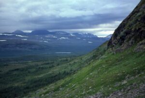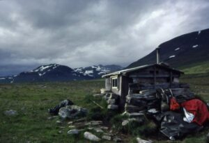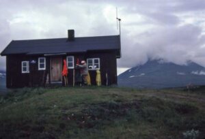 … Yhdeksän tuntia vaellettuamme saavuimme Pältsastuganin tunturituvalle. Siellä oli jo 18 henkeä, joten jouduimme olemaan yön teltoissa. Yö kämpässä olisi maksanut 35 kr. Kämppä oli hienossa paikassa Pältsan-vuoren vieressä. Leirin pystytimme 100 m päähän. Ja ruoka maistui. Kaverit kävivät vähän väliä viemässä kamojaan kämppään kuivumaan ja häiritsivät siinä samalla muita. Sateen ropistessa kattoon vaivuimme uneen.
