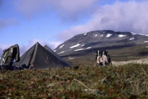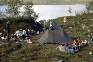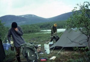 Meikäläinen istuu tällä hetkellä Pältsanstuganin tunturituvassa, mutta tätä ennen on tapahtunut paljon, muun muassa: … Ei ollut sääskiä, ei. Mutta toisaalta alkoi sataan pirusti. Ensin me värjöteltiin yhden ison kiven kupeessa ja odotettiin kuuron loppumista. Mutta sade jatkui. Me lähdettiin liikkeelle edelleen suuntana Pältsastugan. Tavattiinpa pari norjalaistakin matkalla ja ne manaili tätä säätä perkeleesti. Puolessa välissä pidettiin ruokatauko ja se kävi näin: Pistettiin pikavauhtia teltan ulkokatos pystyyn pienelle mäelle järven rantaan ja rahdattiin kamamme sinne.