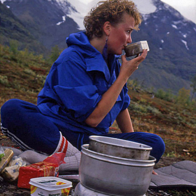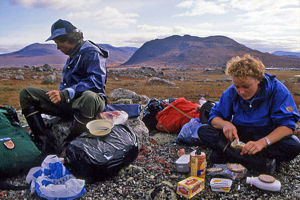 Syötiin yhdessä purouomassa tuulensuojassa. Ranskalaista sipulikeittoa, leipää, teetä. Vesi otettiin pienestä lätäköstä ja ehkä siitä johtui, että mun vatsa tuli vähän kipeäksi. On se vieläkin. Kävin vääntämässä puolikovan paskan ja olo helpotti.