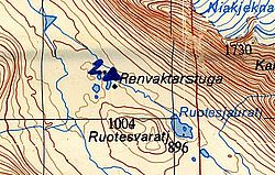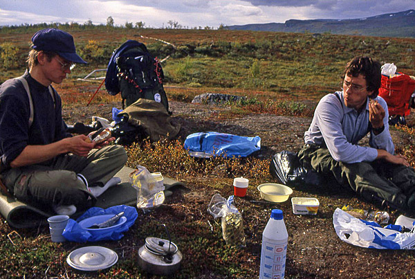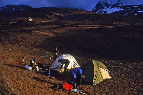 Ahdin kanssa löydettiin loistava (tosissaan!) leiripaikka ylhäältä. Muut eivät halunneet jäädä siihen; olivat skeptisiä, vaikka katselivat sitä noin 100 m alarinteestä. Paikka oli pieni niitty, puro meni vieressä, näköala laaksoon, järvelle, Äparille, Vuoneistsåhkalle – kaiken kaikkiaan loistava leiripaikka. Harmitti lähteä eteenpäin, varsinkin kun pysähdyttiin 500 m päähän huonompaan paikkaan.