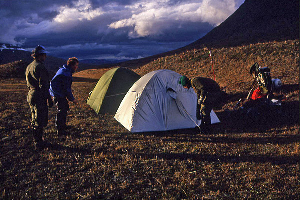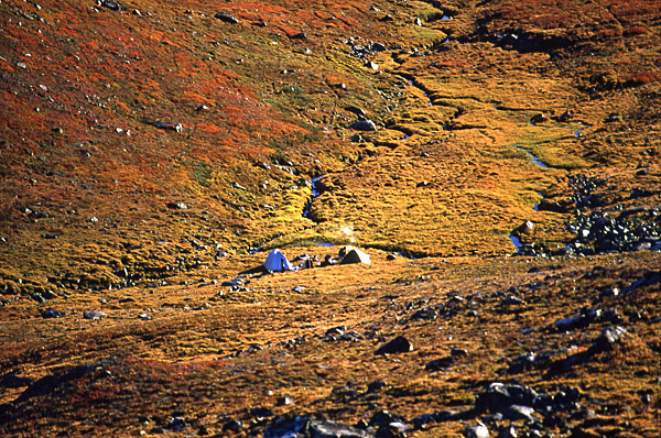 Kämppä oli auki. Sisällä mussutti silavaa kaksi ruotsalaista kollia, joten me tultiin tänne ulos teltalle. Tean ”arktinen malli” ei kestä tuulta, vaan kaaret lommahtaa tuulenpuuskissa. Teltta on Nepalin perintöä.
