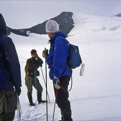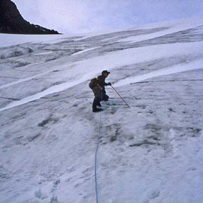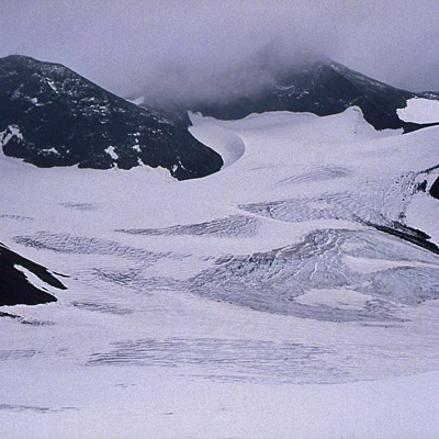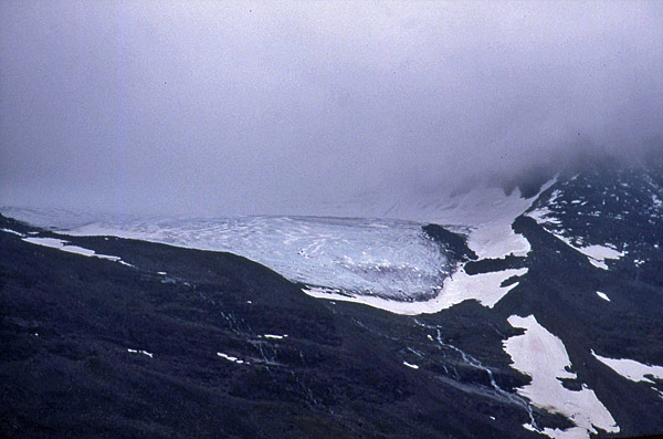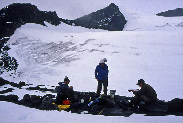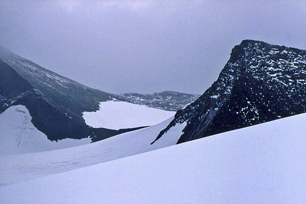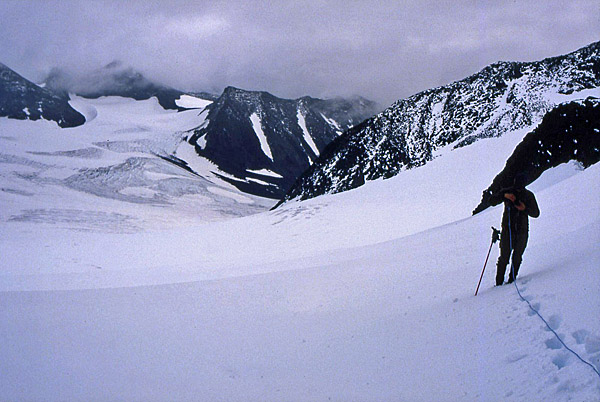 Stortoppenille ym. korkeille oli mahdotonta nousta tällä kelillä. Ahdin kanssa yritettiin nousta Vargtoppenille (1807 m) jäätikön kautta, mutta kiviseinä nousi vastaan. Tea ja Hannu onnistuivat kiviharjannetta pitkin.