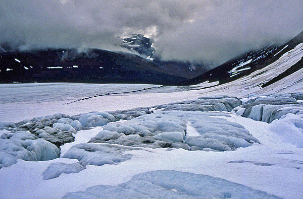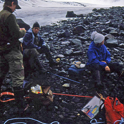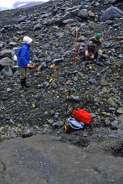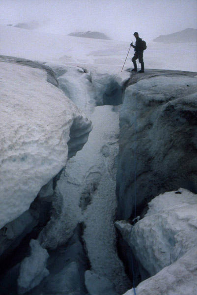 Railot ja kaivot ovat vaarallisia. Ylhäältä löytyy kuitenkin kelvollisia telttapaikkojakin. Ongelmana on: miten saada teltta tukevasti jäähän, huonolla säällä ei voi tehdä mitään. Vettä saa railojen pohjalta narulla ja pullolla. Keskellä jäätikköä olevalta leiriltä voisi tehdä hyvin reissuja joka puolelle. Hygienia?