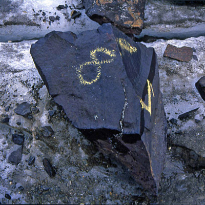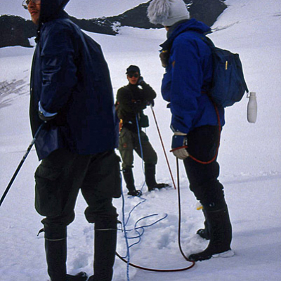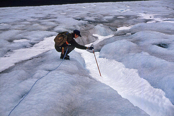 Kovasti oli railoja, toiset isoja, toiset pieniä. Vettä virtasi siellä täällä. Jäätikön keskellä oli kivivana, johon oli merkattu maalilla kymmeniä kiviä. Ehkä ne ilmakuvista pystyy seuraan liikkeitä.